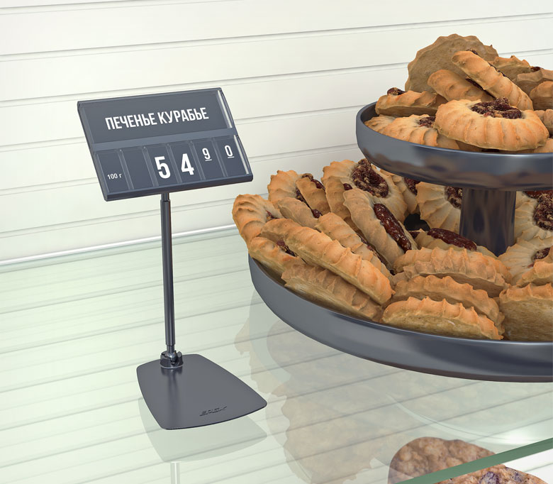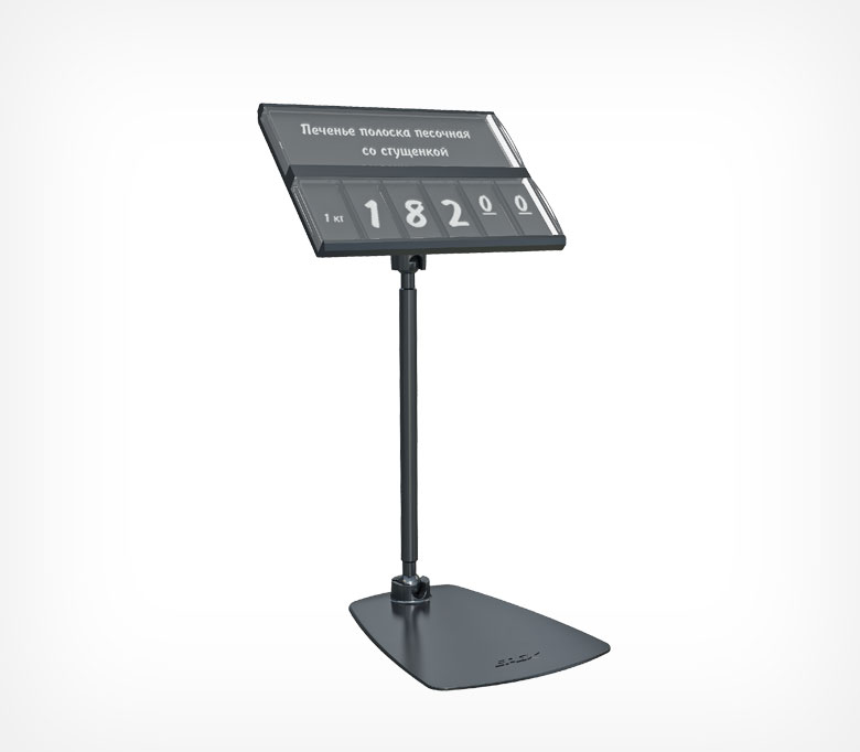 Элегантный держатель на подставке с длиной ножки 100 мм идеально подойдет для отдела «Гастрономия». Шарнирное соединение обеспечивает максимальную подвижность элементов — позволяет задать любой угол наклона и регулировать высоту установки кассеты от 0 до 100 мм от поверхности установки.